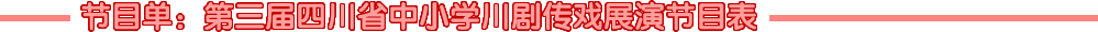 为深入学习贯彻党的十九大报告精神,培育和践行社会主义核心价值观,弘扬优秀传统文化,普及戏曲艺术理念、智慧、气度和神韵,传承四川乡土文脉,促进戏曲艺术及非遗文化在中小学的传承发展,交流展示全省中小学川剧传习普及喜人成果,由四川省精神文明建设办公室、四川省文化厅、四川省教育厅主办的四川省第三届中小学川剧传习普及展演于2017年11月26日下午2点半,在成都市指挥街108号四川省川剧院剧场隆重举行。