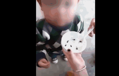 视频内容显示,一位妈妈正在用碗给孩子一勺勺喂活蝌蚪,还哄着孩子说这是小鱼!!