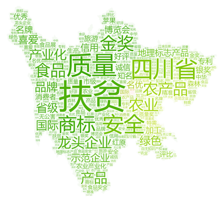 “四川扶贫”公益品牌集体商标是响应中央、省委省政府“扶贫攻坚”工程的重要举措。作为此行活动的重头戏,”四川扶贫”集体商标也是首次亮相“商标品牌节”。我们对其中20余个“四川扶贫”集体商标企业商标、荣誉等相关信息进行词频分析,勾勒四川扶贫”集体商标的数据轮廓。