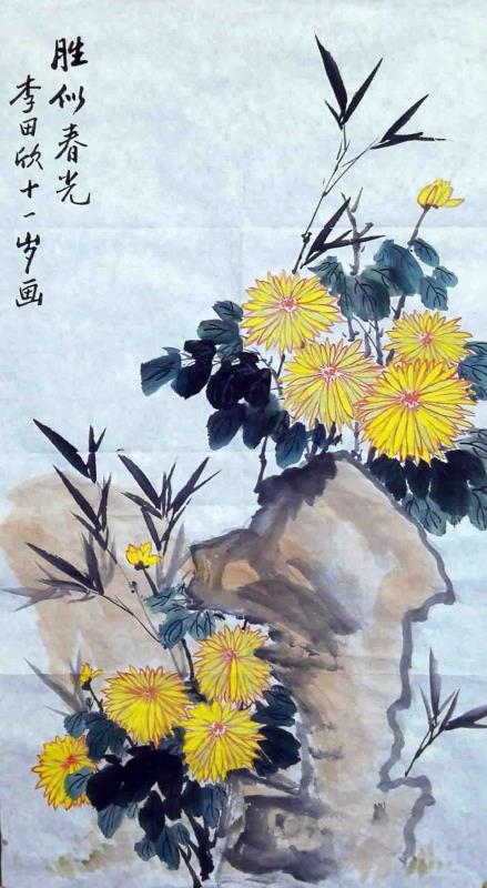 这是一幅秋菊。菊花象征独立,坚强,幽香。它虽然没有牡丹雍容华贵,没有月季娇艳妩媚,没有百合高贵优雅,但它那傲霜精神,确实令人喜爱。在深秋季节,别的花都凋谢了,唯独菊花开的轰轰烈烈,它还给灰色的秋天增添了色彩,它还在寒冷刺骨的秋风里,昂首挺胸的向秋风挑战。