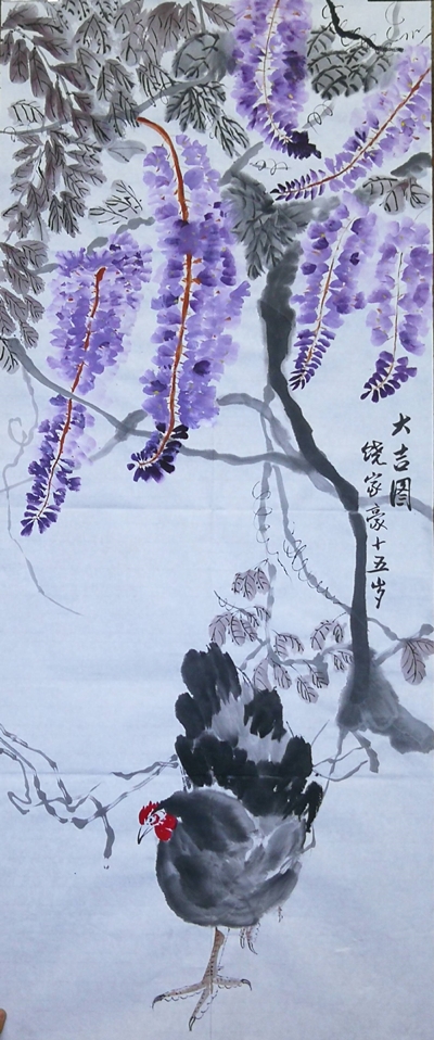 国画介绍:鸡代表着大吉大利,有着宏伟的气势,有着悠久文化的中国一般的气魄,那红色的鸡冠,像飘逸的的五星红旗,屹立于世界。那成串的紫罗兰,更代表着希望与生机,民族的希望