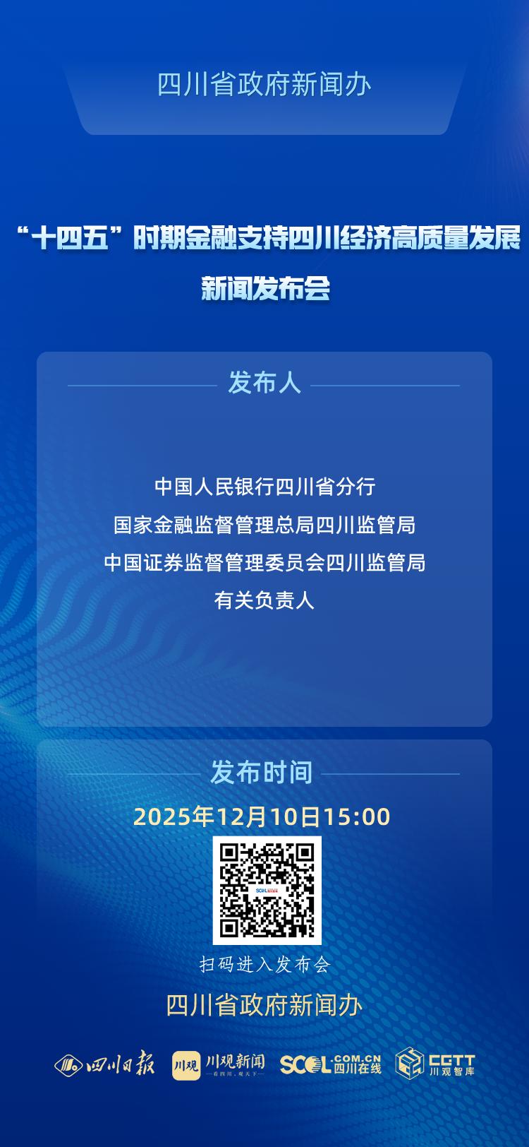 2025年12月10日(星期三)15:00,省政府新闻办将在四川新闻发布厅举行新闻发布会,中国人民银行四川省分行、国家金融监督管理总局四川监管局、中国证券监督管理委员会四川监管局有关负责人介绍“十四五”时期金融支持四川经济高质量发展有关情况并答记者问。