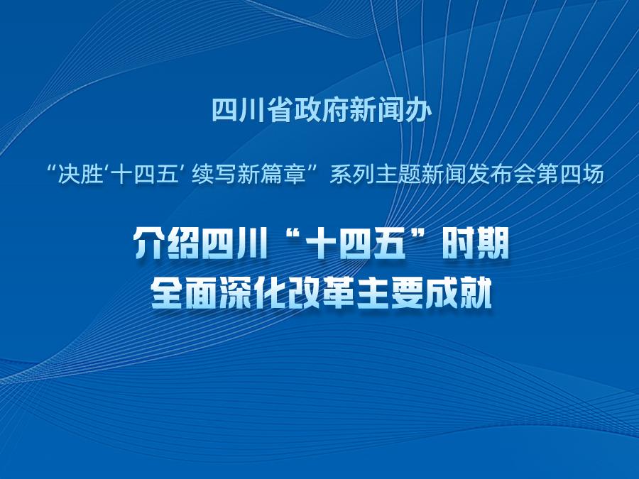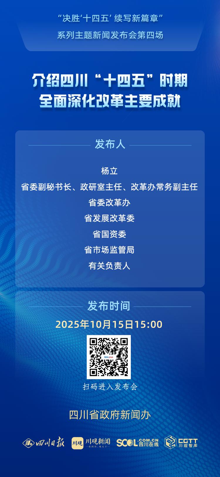 2025年10月15日(星期三)15:00,省政府新闻办将在四川新闻发布厅举行“决胜‘十四五’ 续写新篇章”系列主题新闻发布会第四场,省委副秘书长、政研室主任、改革办常务副主任杨立围绕四川“十四五”时期全面深化改革主要成就作介绍并答记者问,省委改革办、省发展改革委、省国资委、省市场监管局有关负责人参加答记者问。四川在线将全程图文直播,敬请关注!