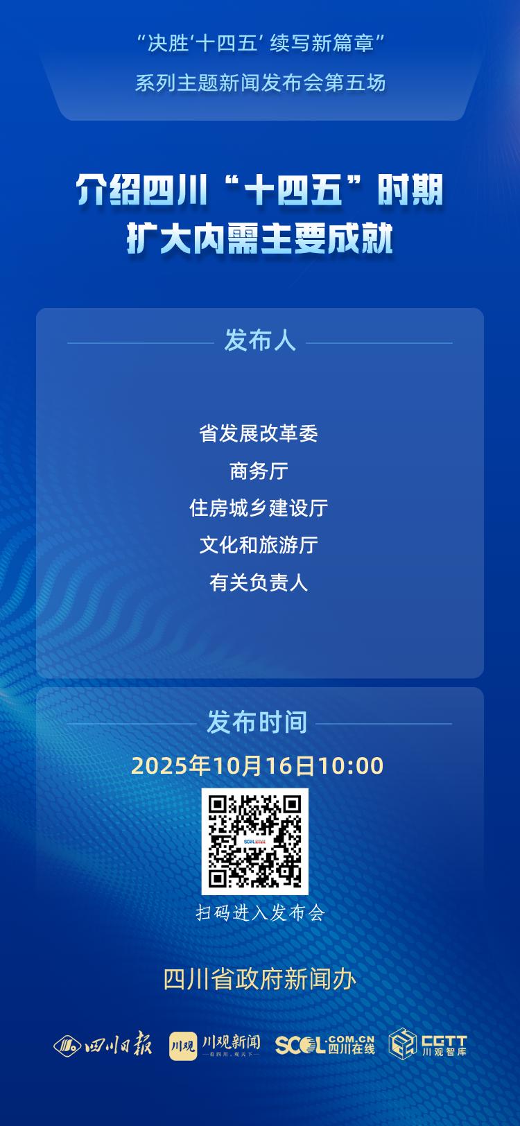 2025年10月16日(星期四)10:00,省政府新闻办将在四川新闻发布厅举行“决胜‘十四五’ 续写新篇章”系列主题新闻发布会第五场,省发展改革委、商务厅有关负责人围绕四川“十四五”时期扩大内需主要成就作介绍并答记者问,住房城乡建设厅、文化和旅游厅有关负责人参加答记者问。四川在线将全程图文直播,敬请关注!