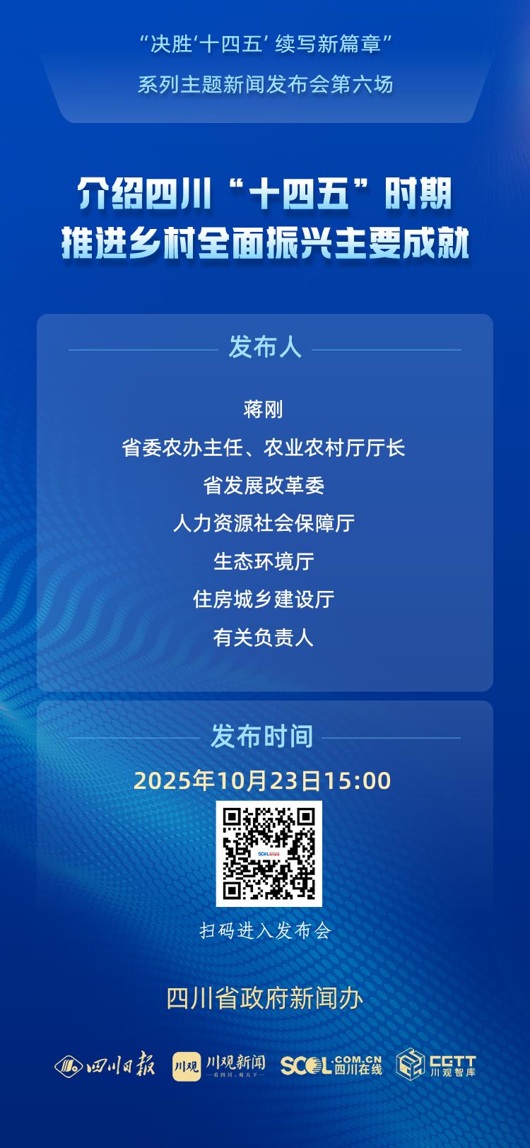 2025年10月23日(星期四)15:00,省政府新闻办将在四川新闻发布厅举行“决胜‘十四五’ 续写新篇章”系列主题新闻发布会第六场,省委农办主任、农业农村厅厅长蒋刚围绕四川“十四五”时期推进乡村全面振兴主要成就作介绍并答记者问,省发展改革委、人力资源社会保障厅、生态环境厅、住房城乡建设厅有关负责人参加答记者问。四川在线将全程图文直播,敬请关注!