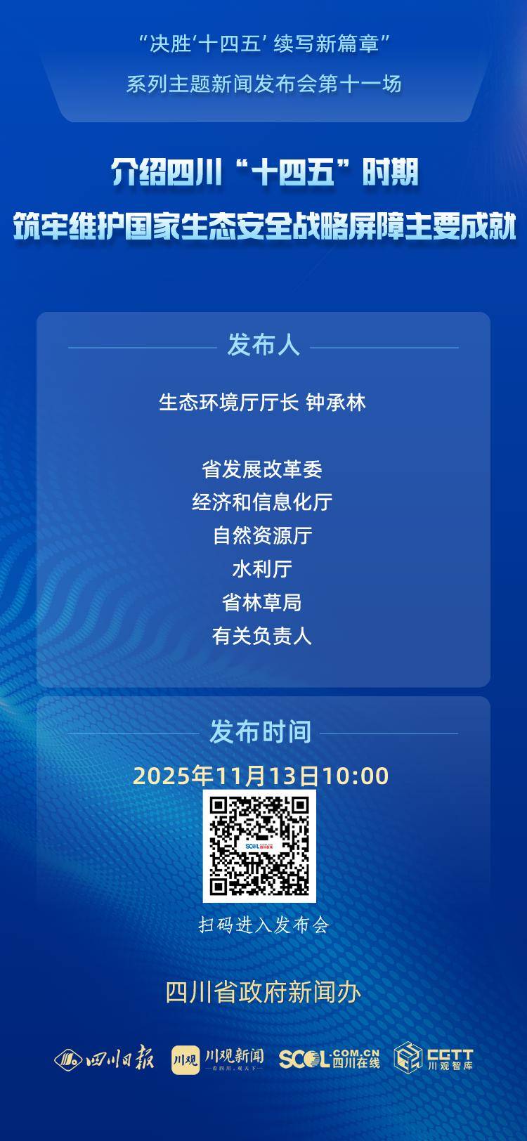 2025年11月13日(星期四)10:00,省政府新闻办将在四川新闻发布厅举行“决胜‘十四五’ 续写新篇章”系列主题新闻发布会第十一场,省生态环境厅厅长钟承林围绕四川“十四五”时期筑牢维护国家生态安全战略屏障主要成就作介绍并答记者问,省发展改革委、省经济和信息化厅、省自然资源厅、省水利厅、省林草局有关负责人参加答记者问。四川在线将全程图文直播,敬请关注!