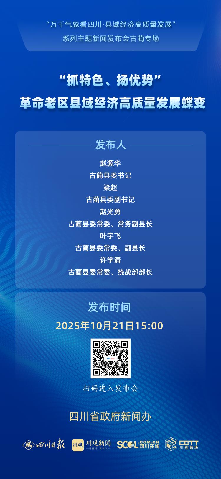 2025年10月21日(星期二)15:00,省政府新闻办将在四川新闻发布厅举行“万千气象看四川·县域经济高质量发展”系列主题新闻发布会古蔺专场,古蔺县委书记赵源华将围绕“‘抓特色、扬优势’ 革命老区县域经济高质量发展蝶变”作介绍并答记者问,古蔺县委副书记梁超,古蔺县委常委、常务副县长赵光勇,古蔺县委常委、副县长叶宇飞,古蔺县委常委、统战部部长许学清答记者问。四川在线将全程图文直播,敬请关注!