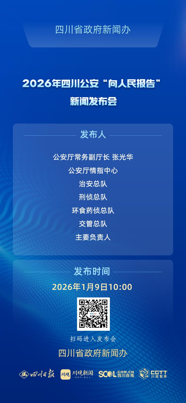 2026年1月9日(星期五)10:00,四川省人民政府新闻办公室将举行2026年四川公安“向人民报告”新闻发布会,省公安厅常务副厅长张光华介绍有关内容并答记者问,省公安厅情指中心、治安总队、刑侦总队、环食药侦总队、交管总队主要负责人答记者问。四川在线将全程图文直播,敬请关注!