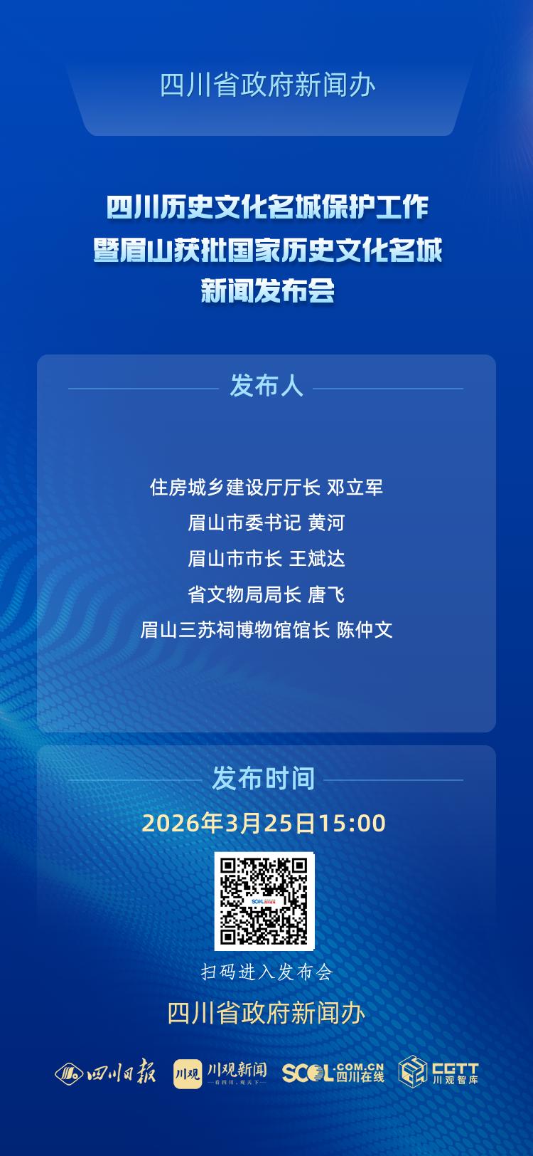 2026年3月25日(星期三)15:00,省政府新闻办将在四川新闻发布厅举行新闻发布会,住房城乡建设厅厅长邓立军介绍四川城乡历史文化保护利用传承相关情况;眉山市委书记黄河介绍眉山国家历史文化名城保护和申报情况,并答记者问。眉山市市长王斌达和省文物局局长唐飞、眉山三苏祠博物馆馆长陈仲文参加答记者问。