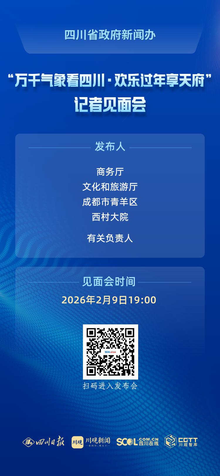 2026年2月9日(星期一)19:00,省政府新闻办将在西村大院举行“万千气象看四川·欢乐过年享天府”记者见面会,请商务厅、文化和旅游厅、成都市青羊区、西村大院有关负责人与记者见面交流。四川在线将全程图文直播,敬请关注!