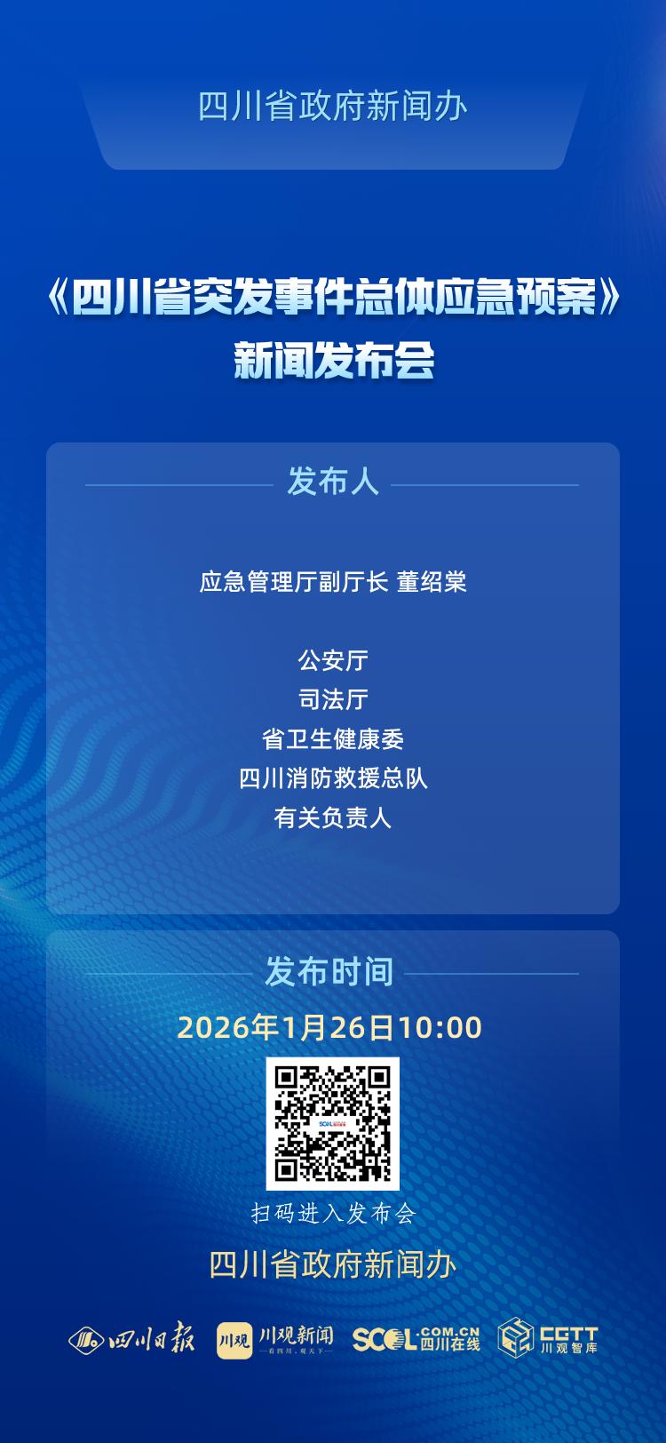 2026年1月26日(星期一)10:00,省政府新闻办将在四川新闻发布厅举行新闻发布会,解读《四川省突发事件总体应急预案》,省应急管理厅副厅长董绍棠和省公安厅、省司法厅、省卫生健康委、四川消防救援总队有关负责人介绍和解读《省总体预案》相关内容,并答记者问。四川在线将全程图文直播,敬请关注!