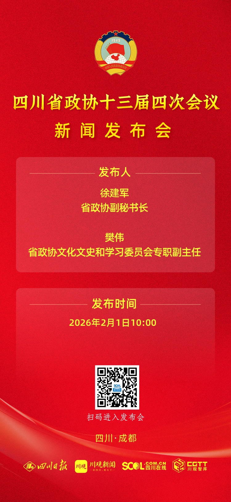 2026年2月1日(星期日)上午10:00,四川省政协十三届四次会议新闻发布会将在四川新闻发布厅举行,省政协副秘书长徐建军、省政协文化文史和学习委员会专职副主任樊伟介绍会议筹备有关情况,并答记者问。四川在线将全程图文直播,敬请关注!