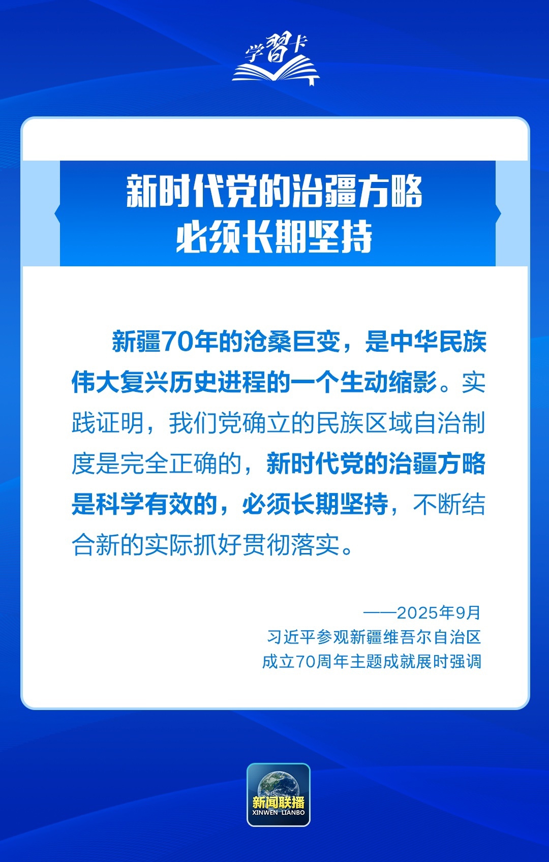 今年是新疆维吾尔自治区成立70周年。新疆工作事关强国建设、民族复兴大局。