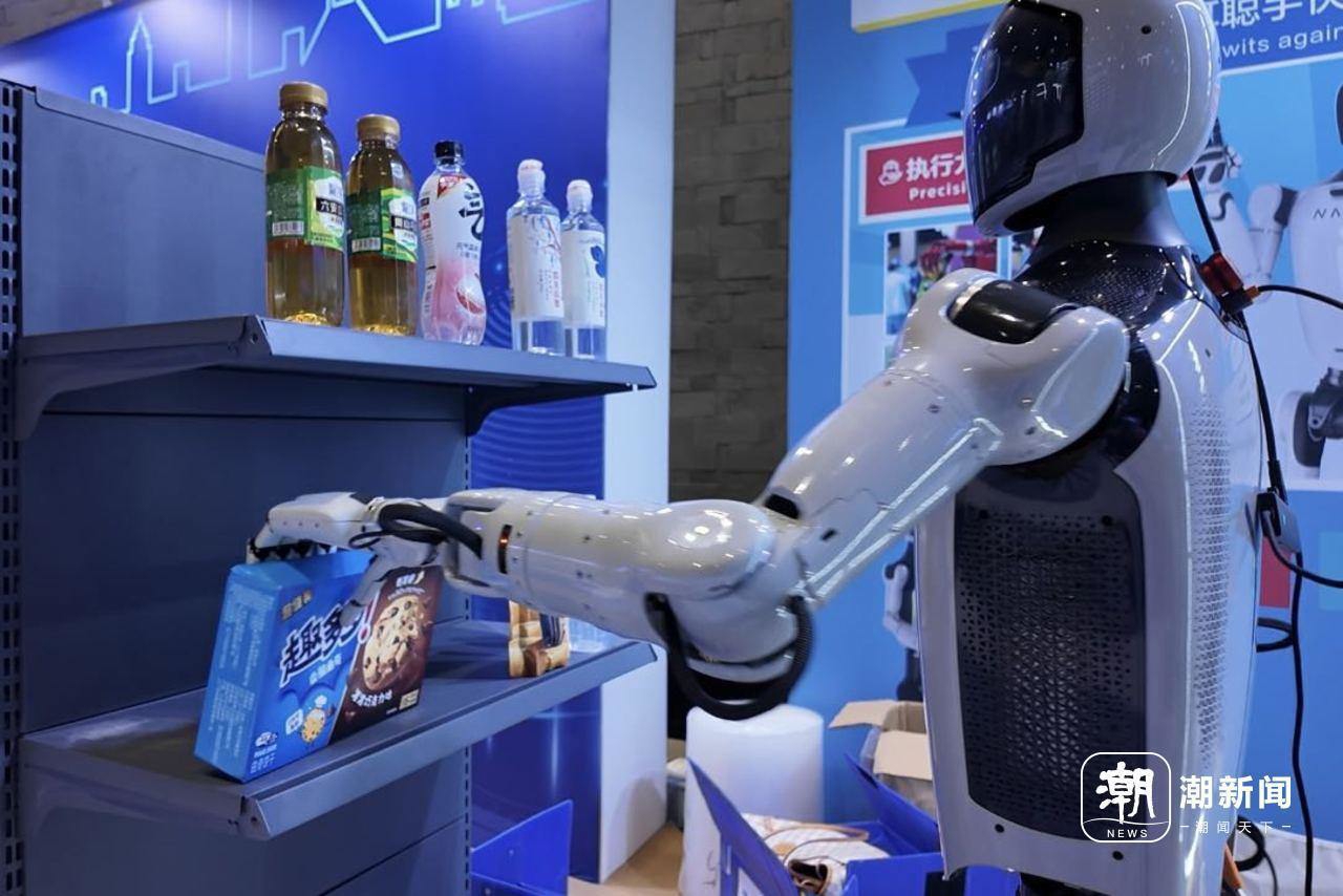 一旁,来自浙江人形机器人创新中心的零售机器人“小i”灵活穿梭在人群中。无需手动操作,只要对着它随口说一句“想要一包坚果”“来瓶矿泉水”等指令,内置的智能语音交互系统便会立刻精准识别需求,紧接着机械臂灵活转动,在储物格中精准定位目标商品,指尖的压力传感器巧妙把控力度,稳稳捡拾后缓缓递到人们手中,全程不过十几秒。