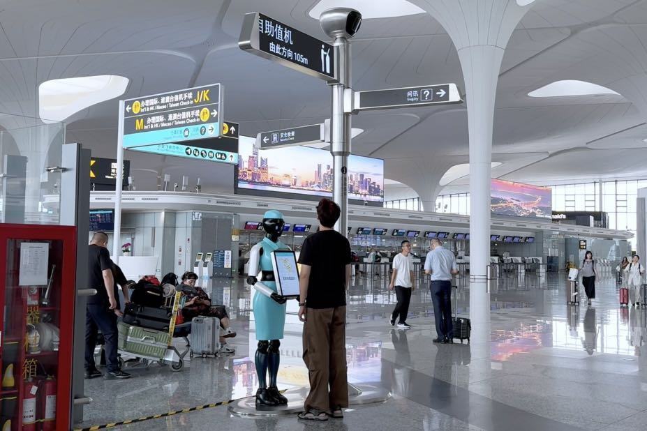 走出“智趣小屋”,场馆里的AI导览机器人成为最忙碌的“引路者”,它们胸前的LED动态指引屏实时显示最优路线,遇到咨询的观众,能立刻用清晰的语音解答。浙江朗域视觉科技有限公司商务经理程杰介绍,其AI智能导览服务机器人目前已部署于国内30个省份和国外的中东地区,用“AI交互+动态响应+数据融合”重塑服务体验,“我们提供一套集成的服务系统,包括智能解说、互动问答、引导和数据分析,集成了物联网技术、多语言模型和AI代理,解决方案在中国排名首位。”此外,其交通枢纽服务机器人支持9国语种切换,能精准回应路线、票务等各类查询,目前已在杭州萧山国际机场落地运营,让智慧出行不再遥远。