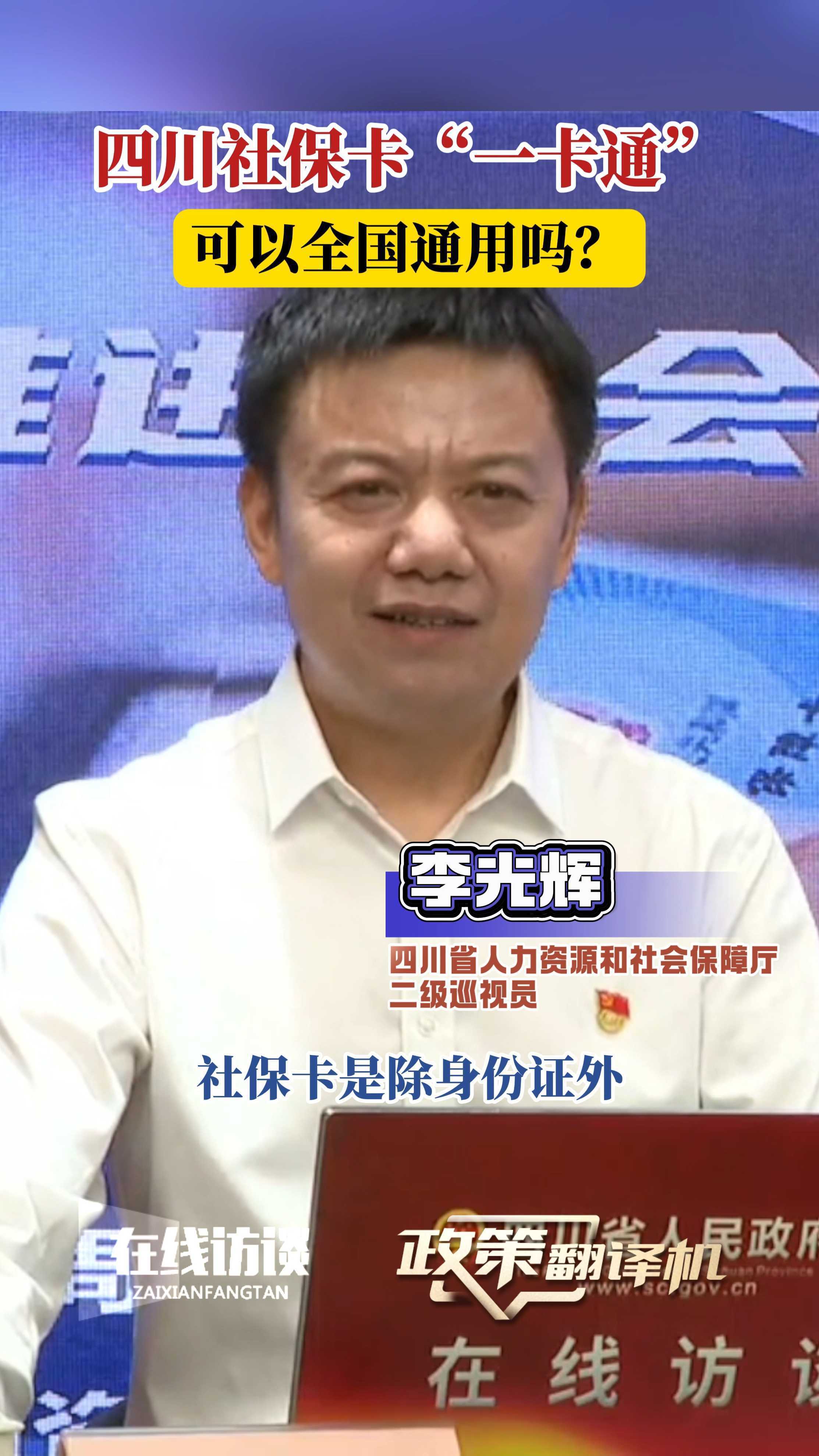 社保卡具有身份凭证功能,能全国通用吗?四川省人力资源和社会保障厅二级巡视员李光辉:目前我省社保卡已实现在人社服务、资金发放、政务服务、医疗卫生、文化体验、旅游观光等多领域应用,全国通用正在探索推进。