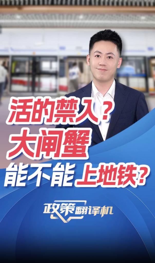 最近,在上海地铁站,一对青年男女试图携带大闸蟹乘车被劝阻。站方给出的理由是,根据相关规定,活的大闸蟹不能进站乘车。所有大闸蟹都不能上地铁吗?携带大闸蟹等水产品上地铁要注意啥?@政策翻译机 为你翻一翻。
