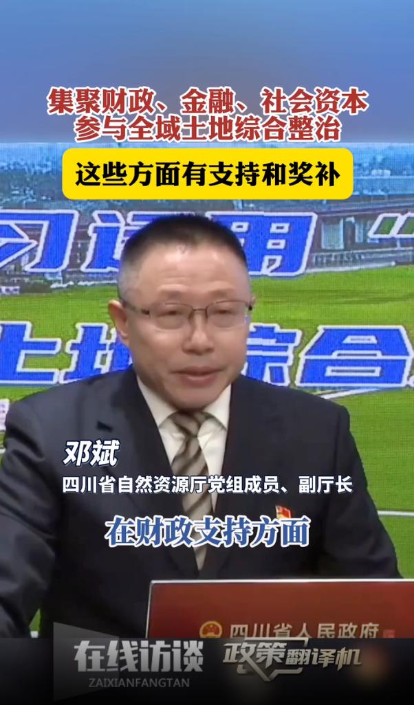 11月5日,四川省自然资源厅党组成员、副厅长邓斌介绍《关于学习运用“千万工程”经验 深入推进全域土地综合整治工作的实施意见》,其中提到,集聚财政、金融、社会资本参与全域土地综合整治,四川分别有支持和奖补措施。政策翻译机为你解读。