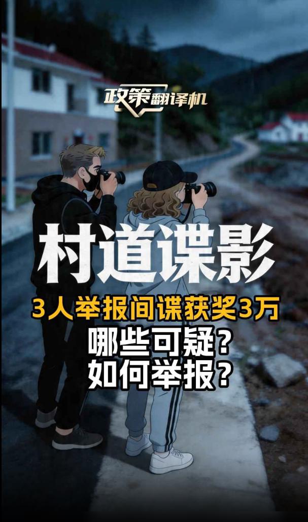 村里一处偏僻小道上,突然出现了两名外国人在拍照,天色灰蒙,他们却说在拍山川、天空,可疑的是,他们总徘徊在正在施工的国家重大建设项目周围。雅安市雨城区某村的小姜觉得可疑,立即上报,最终国家安全机关确认,两名外籍人员就是间谍。4月13日,3人获奖共计3万元。帮助国家抓到间谍,同时还收获了奖励,那对于大家来说,哪些情况应该提高警惕,又该怎么举报呢?@政策翻译机 带你了解 。