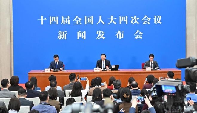 3月12日,十四届全国人大四次会议第三场“部长通道”在人民大会堂举行,司法部部长贺荣接受记者采访。