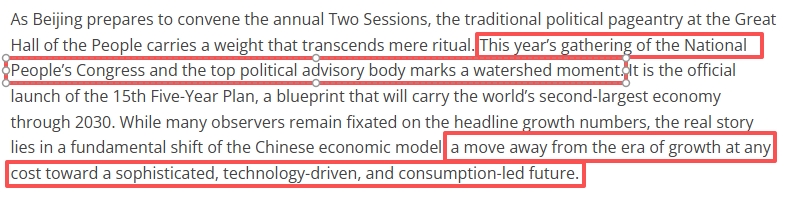 文章还说,今年的中国全国两会最值得关注的一方面,是对扩内需和促消费的重视。“十五五”规划建议将“居民消费率明显提高”作为重要目标,为实现这一目标,政策重点正转向“银发经济”(老年人护理和服务)和“低空经济”(无人机和短程航空)等领域,通过加强社会保障、鼓励服务消费,中国正努力构建更具韧性的国内市场,使其不易受全球贸易周期和外国关税的影响。这种内部再平衡将把庞大人口数量转变为经济需求的主要引擎,而不仅是全球生产基地。