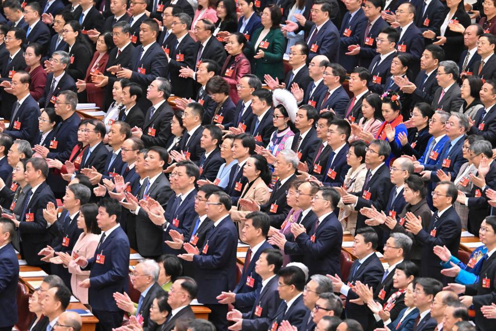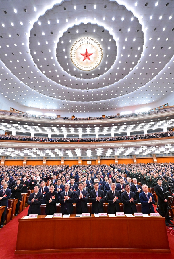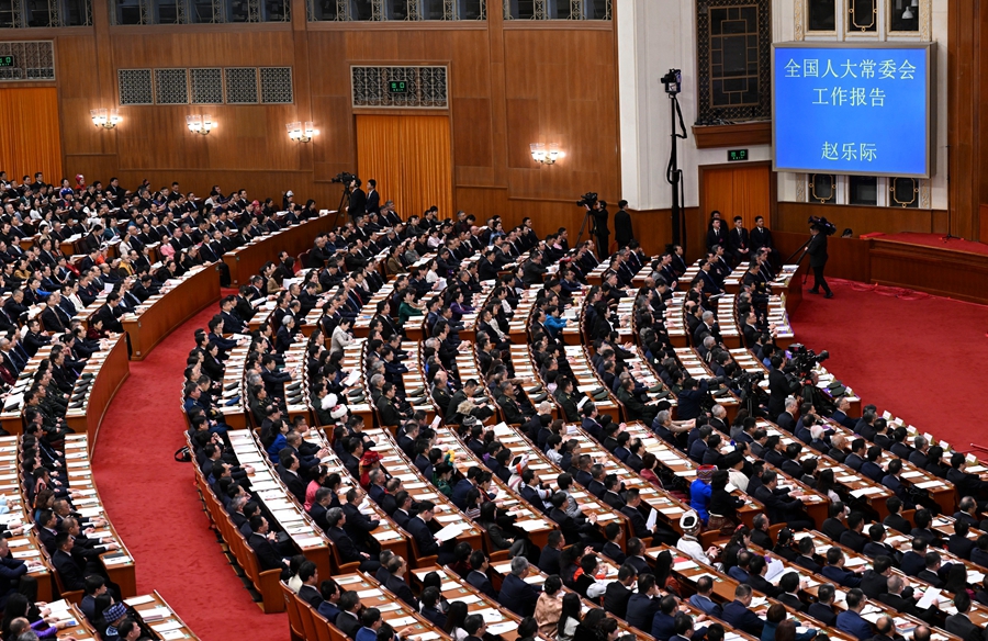 3月9日,十四届全国人大四次会议在北京人民大会堂举行第二次全体会议。受全国人大常委会委托,赵乐际委员长向大会报告全国人大常委会工作。